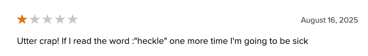 I tend to self-deprecate but I do think it’s a fun read, and I’ve heard the same thing from more than a few readers. Well, except for this one, obviously, who took to Goodreads to express their anger and, oddly, nausea, about my use of the word “heckle”.